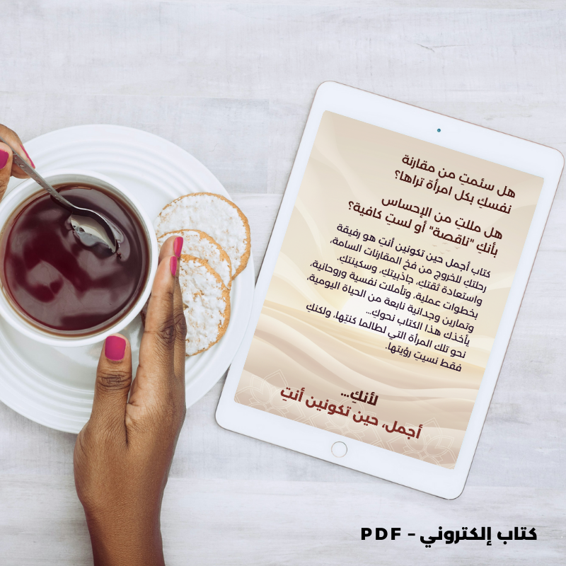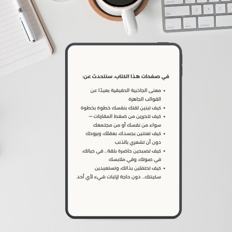 كتاب إلكتروني وجداني يُخاطب المرأة بلغة حب الذات والأنوثة الصادقة. بصيغة PDF، يُرسل لبريدك فور الشراء، ويُقرأ من القلب إلى القلب.
